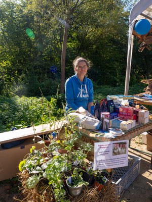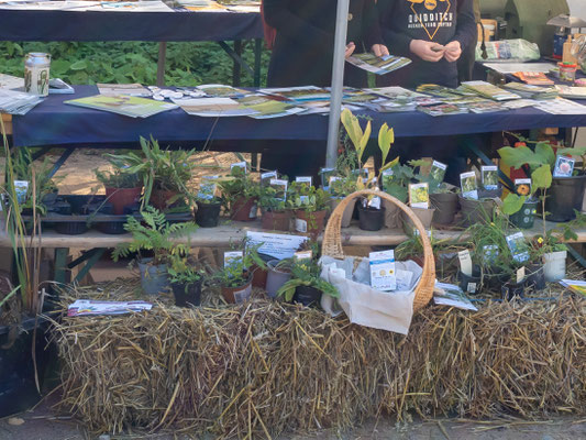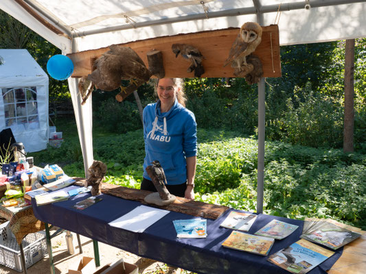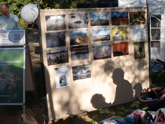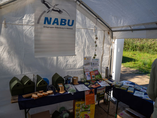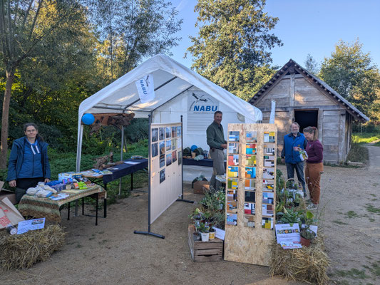 Bei wunderschönem Wetter haben wir unseren NABU-Infostand beim Landmarkt im Wallmuseum aufgebaut und über 100 heimische Stauden gegen Spende abgegeben. Ein kleiner Stand mit fair gehandelten Bio-Lebensmitteln sowie ein Infostand über Bienen und deren Bedrohung u.a. durch Ackergifte ergänzten die Ausstellung. Ein selbstgebautes Vogelrätsel war das Highlight des Standes. Ferner haben wir einige präparierte Vögel geschenkt bekommen, die wir präsentieren konnten. Sie waren Grundlage für viele Gespräche über Erlebnisse mit diesen Vögeln. Ein QR-Code hat die Besucher zur Online-Wahl "Vogel des Jahres 2026" geführt. Auf einer Foto-Stellwand haben wir über unsere Arbeit in den Schutzgebieten, am Strand und am Krötenzaun informiert. Der Stand war sehr gut besucht und die Helfer hatten alle Hände voll zu tun.